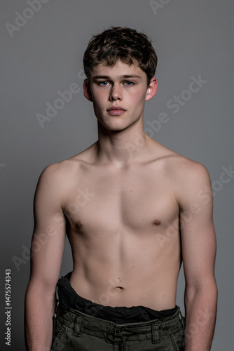 © NNS Studio, Fototapeta premium Young Male Fitness Model Studio Portrait Serious Expression Athletic Confident Shirtless Groomed Headshot Modern Minimalist Style Healthy Muscular Posed Natural Look Emotion Fashion