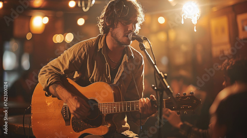 Obraz premium Young male musician playing guitar and singing