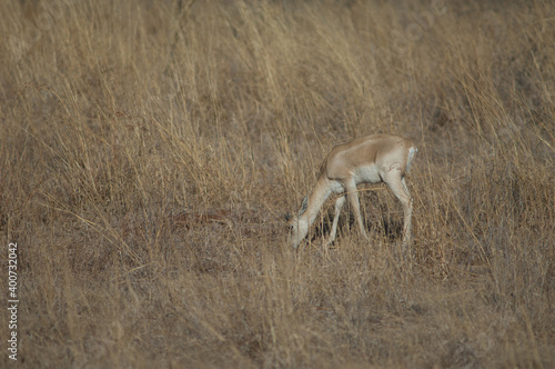 Naklejka premium Young male of blackbuck Antilope cervicapra feeding. Devalia. Gir Sanctuary. Gujarat. India.