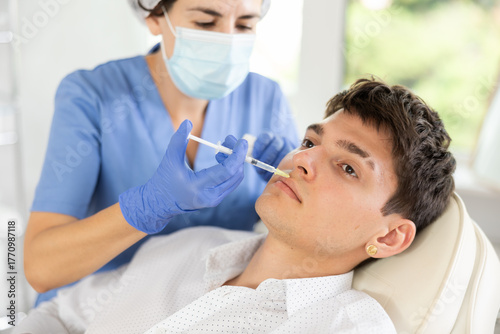 Fototapeta premium Young male patient lying on clinical chair undergoing face care procedure by injection method