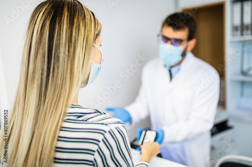 Obraz premium Young male practitioner with face protective mask working at clinic reception...