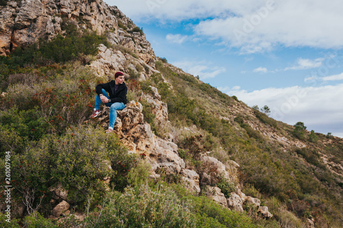 Fototapeta premium Young male sits on the rock and enjoys beautiful mountain landscape.
