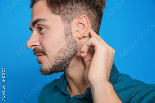 © New Africa, Obraz premium Young man adjusting hearing aid on color background