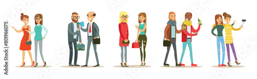 Fototapeta premium Young Man and Woman Friends Spend Time Together Vector Set