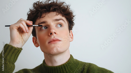 © A2Z AI , Obraz premium Young man applying eyebrow gel with a brush, looking upward thoughtfully. Soft lighting emphasizes his features against a neutral backdrop.