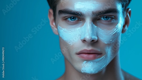 © fotofabrika, Fototapeta premium Young man applying facial mask with a blue background in a skincare routine at home during evening hours for a fresh complexion
