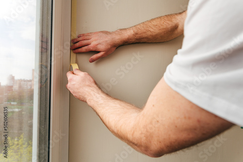 Obraz premium Young man applying mounting tape before sealing a window