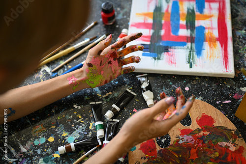 © Prathankarnpap, Obraz premium Young man artist concentrating on his painting in bright art studio. Art, education and creative hobby concept