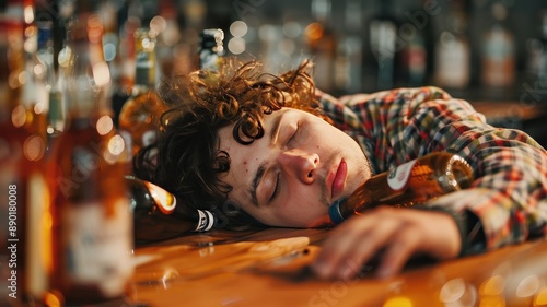 © Kanin, Obraz premium Young man asleep on a bar counter, surrounded by empty beer bottles, reflecting exhaustion or intoxication in a nightlife setting.