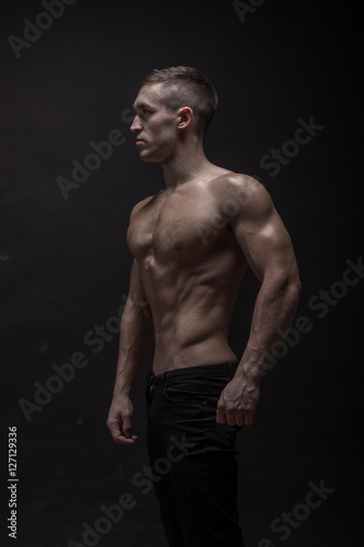 Fototapeta premium young man, bodybuilder posing, side view, profile