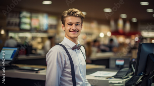 © notannft, Fototapeta premium Young man cashier at supermarket.