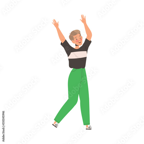 © Happypictures, Fototapeta premium Young Man Character Raising Hands in Triumph Showing Hand Gesture Expressing Positive Emotion Vector Illustration