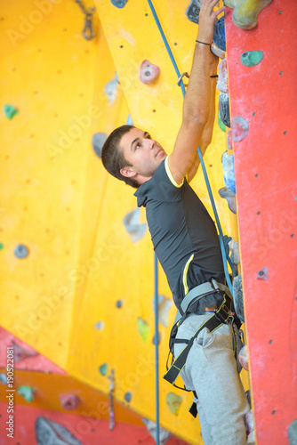 © auremar, Obraz premium young man clibming indoor wall with safety rope