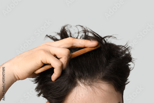 © Pixel-Shot, Naklejka premium Young man combing hair on grey background, closeup