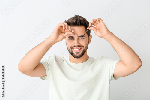 © Pixel-Shot, Naklejka premium Young man correcting eyebrows on light background