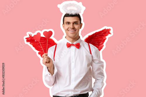 Obraz premium Young man dressed as Cupid with paper hearts on pink background. Valentine's...