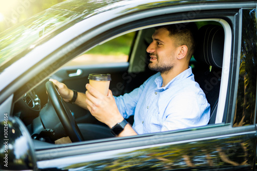 Naklejka premium Young man drinking coffee while driving the car