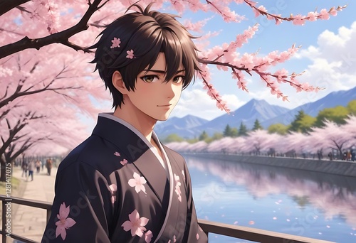 © Ibnu, Fototapeta premium Young Man Enjoying Blossoms in the Beautiful Cherry Blossom Season