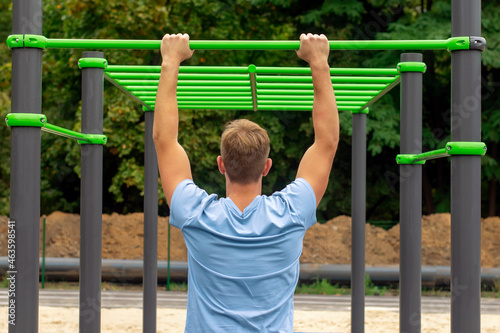 © Юлия Усикова, Obraz premium Young man exercising on horizontal bar outdoors. Back view