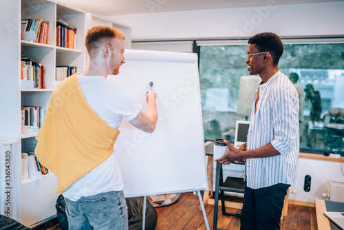 © BullRun, Obraz premium Young man explaining data for black colleague