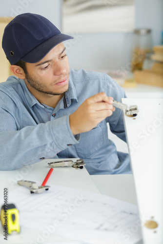 © auremar, Fototapeta premium young man fitting wardrobe in kitchen cabinet