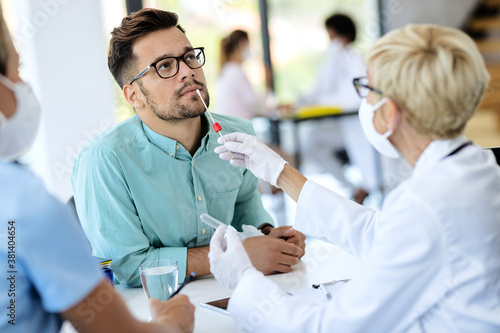 Obraz premium Young man getting tested for coronavirus at medical clinic.