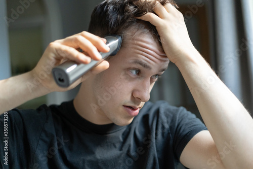 Fototapeta premium Young man giving himself a haircut