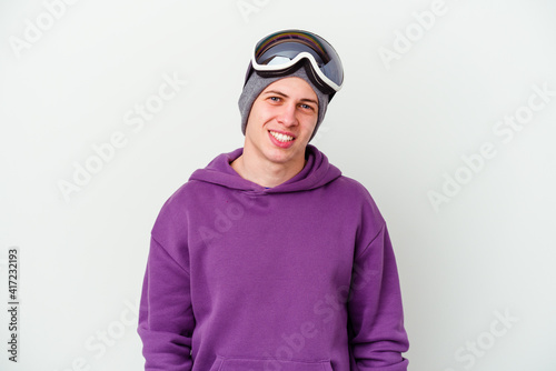 © Asier, Fototapeta premium Young man holding a snowboard board isolated on white background happy, smiling and cheerful.