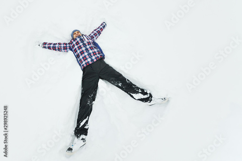 © Evgeniy Kalinovskiy, Fototapeta premium young man in a plaid outerwear or jacket lies on the snow and makes the figure of an angel. Winter fun