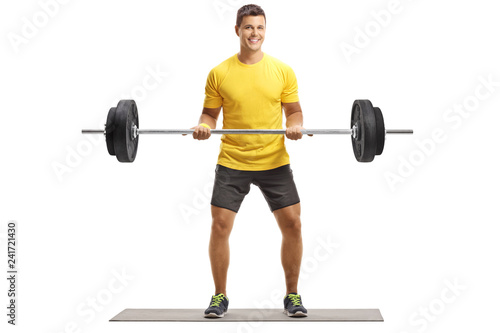© Ljupco Smokovski, Fototapeta premium Young man in a yellow t-shirt exercising weightlifting