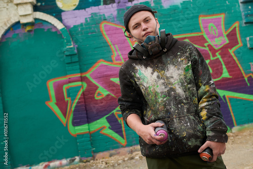 Fototapeta premium Young man in black stylish hoodie looking at camera while standing against green brick wall with graffiti artwork