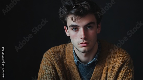 © alan, Obraz premium Young man in cardigan, extra space.