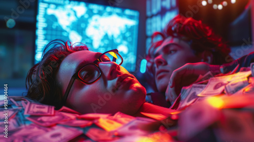 Obraz premium Young Man in High-Tech Office with Money and Digital World Map
