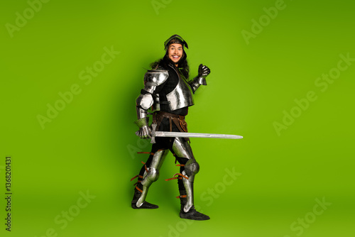 © deagreez, Naklejka premium Young man in medieval knight armor with sword posing on a bright green background
