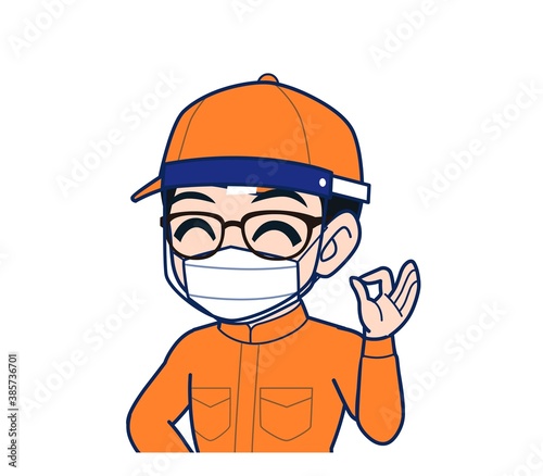 © su_cocoroe, Obraz premium Young man in orange work clothes