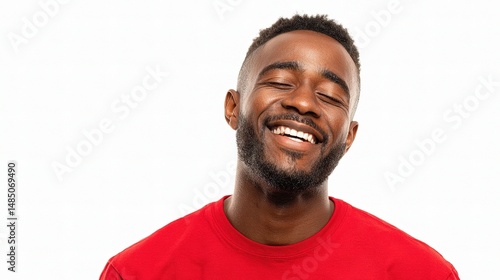 © Isolated studio, Obraz premium Young Man in Red Shirt Laughing with Eyes Closed and Joyful Expression