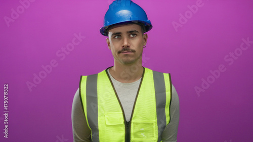 Fototapeta premium Young man in reflective vest and hardhat stands against an isolated pink background wall, appearing thoughtful and focused, embodying a professional and confident attitude.