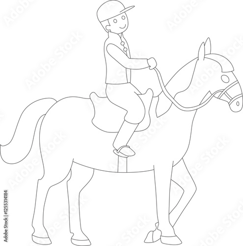 © Nata, Fototapeta premium young man in rider uniform smiling and sitting on horse side view