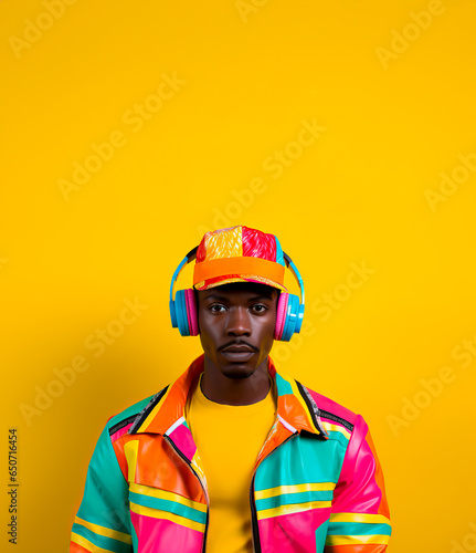 Obraz premium Young man in 90s style clothing wearing a headset looking stylish and funky. Fashion style photograph in a colorful 1990ies style. Yellow Studio background with copy space.
