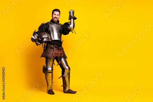 Naklejka premium Young man in shiny medieval armor holding a helmet with a cheerful gesture on vibrant yellow background
