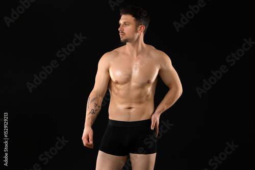 Fototapeta premium Young man in stylish underwear on black background