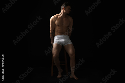 © New Africa, Fototapeta premium Young man in stylish white underwear on chair against black background