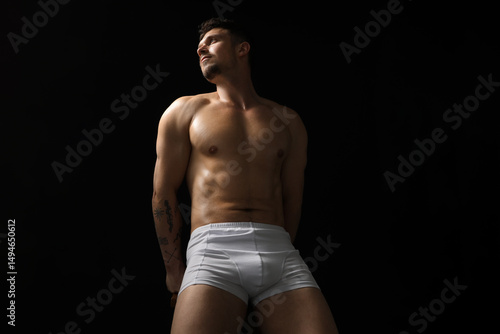 Fototapeta premium Young man in stylish white underwear on chair against black background, low angle view