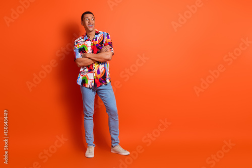 Fototapeta premium Young man in vibrant shirt stands confidently against a vivid orange background, embodying youthful flair and contemporary style