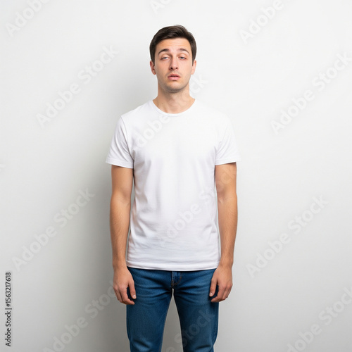 © tyt.production, Fototapeta premium Young Man in White T-Shirt Expressing Confusion or Surprise