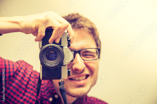 Fototapeta premium Young man is taking a picture with a vintage camera