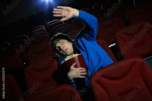 Naklejka premium Young man is terrified by the scene seen on the screen in cinema hall