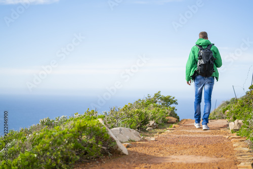 Naklejka premium Young man is walking along a beautiful hiking trial at Cape Point, South Africa