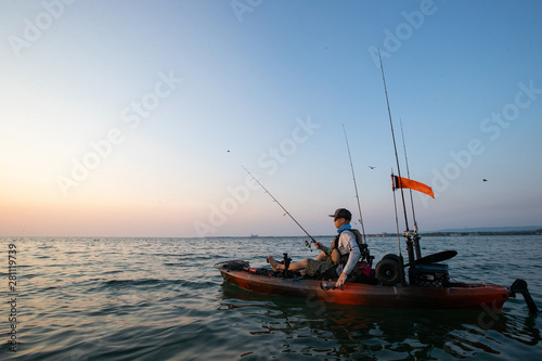 © Colin, Obraz premium Young Man Kayak Fishing at Sunrise in Canada