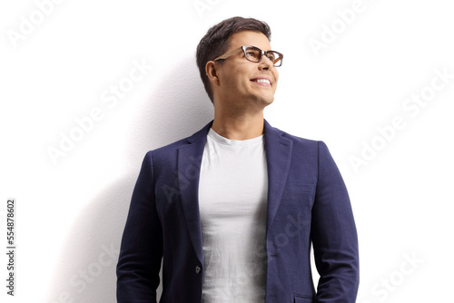 © Ljupco Smokovski, Fototapeta premium Young man leaning on a white wall and looking up